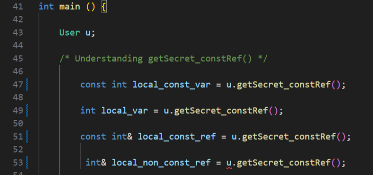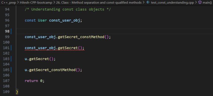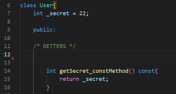 Not const objects like the previously used “User u” can call non-const methods like getSecret() as well as const methods like getSecret_constMethod().