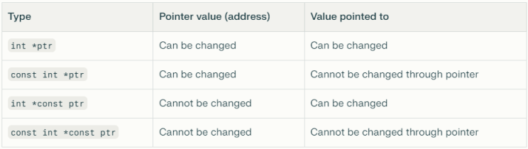 const int *const ptr –> ptr can neither be reassigned to point to some other int value nor can it change the value at the location it is currently pointing to.