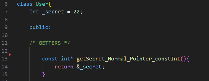 Method returning const int * This method returns a pointer to a constant integer (_secret). This means the variable assigned with the return value of this method can be used to read the value of “_secret” but it cannot be use to change the value of _secret.