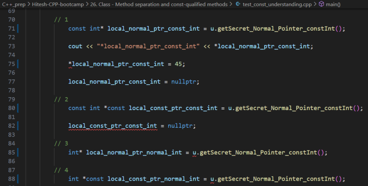 Because, here local_const_ptr_normal_int cannot be reassigned to point to a new address, but the value at the address being pointed to can be changed. This is not what getSecret_Normal_Pointer_constInt() lets us do with a return type of “const int*”.